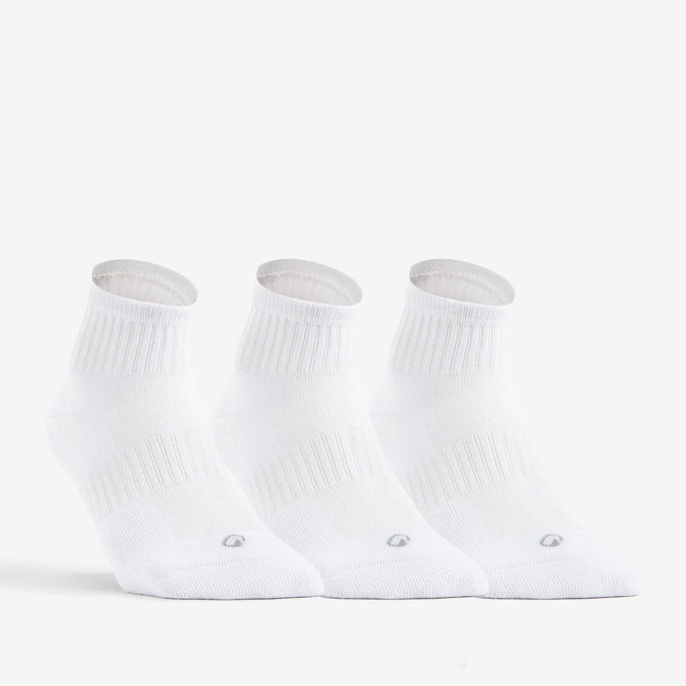 Ces chaussettes de sport mi-hautes sont résistantes et absorbent la sueur grâce à leur zone en bouclette. L'aération libère la chaleur et le serrage assure un maintien stable. Lot de 3.