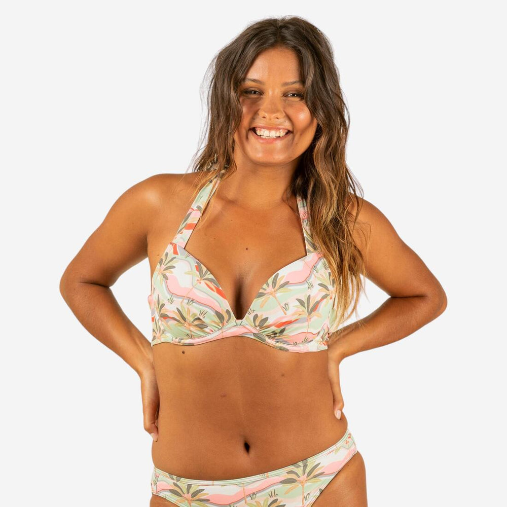Ce haut de maillot de bain à effet push-up valorise le décolleté, il est monté sur basque, avec armatures et coques fixes. Son nouage dos et cou légèrement drapé, assure maintien et confort.