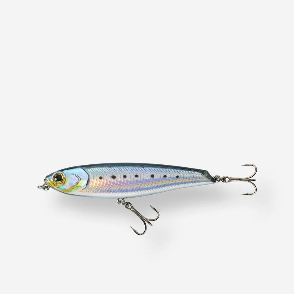 - Taille : 9,5 cm - Forme : Stickbait ou pencil - Coloris : Bleu sardine, Blanc, Fluo mahi, Ghost - Poids : 12,5 gr - Hameçons : 2 triples VMC 7554 Cn T6 - Densité : Flottant (reste en surface) - Bruiteur : Oui - Type d'équilibrage : système à masselottes - Armature à œillets - Profondeur de nage : en surface