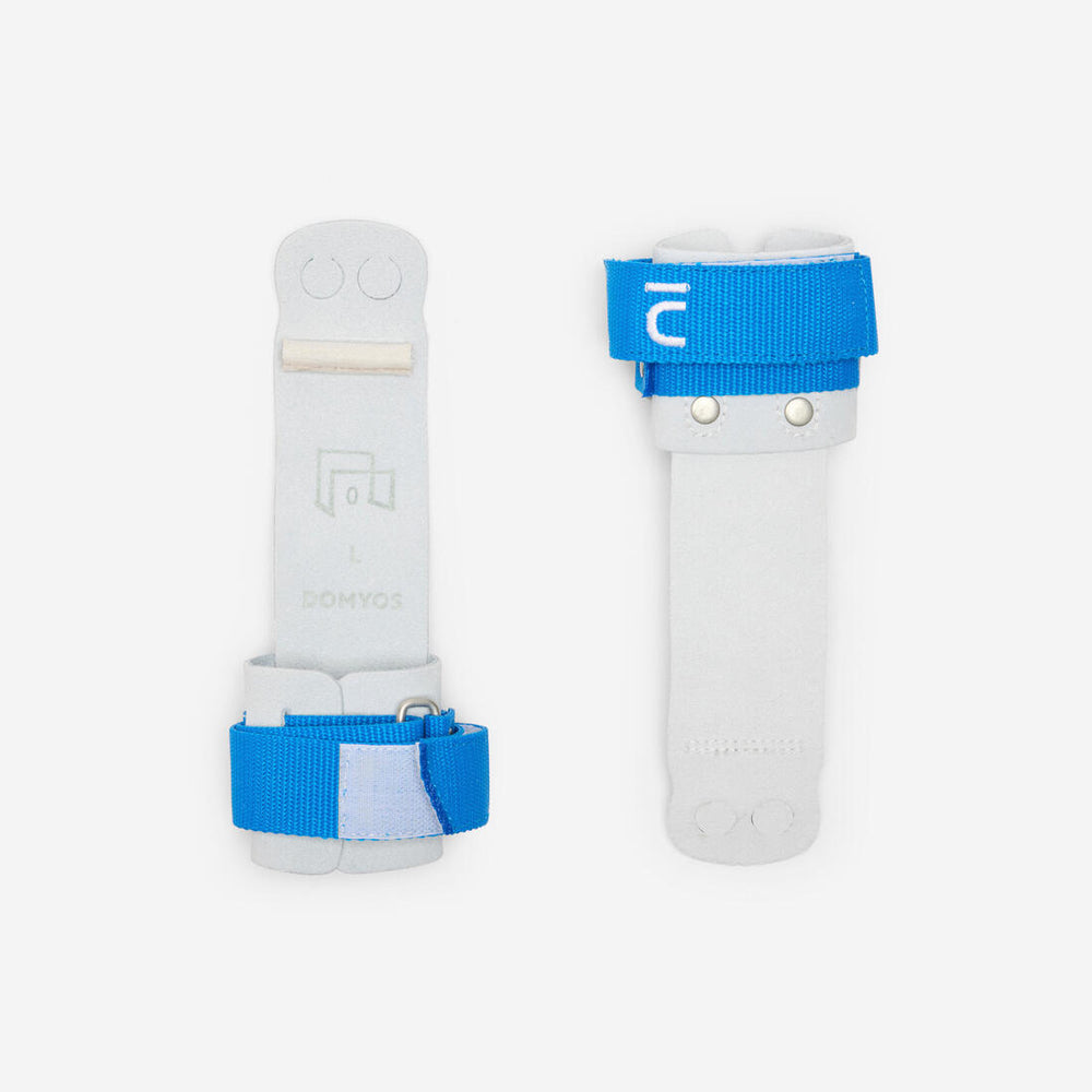 Passez ensuite la manique autour du poignet. La sangle bleue doit passer sous l’os du poignet. Déployez la manique contre la main tendue et regardez si l’extrémité du cuir est bien placé (elle doit arriver à la limite de la première phalange du majeur). Les maniques conçues pour les barres asymétriques possèdent 2 trous (un pour l'annulaire et un pour le majeur), ainsi qu'un fin bourrelet pour favoriser l’accroche à l’agrès.
