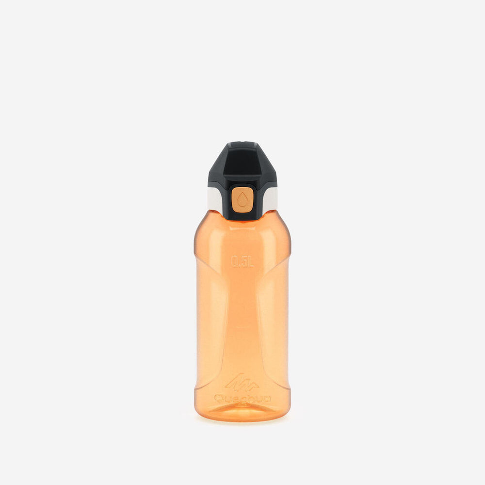 Cette gourde de 0,5 L accompagne les enfants en randonnée. Son bouchon s'ouvre d'une main grâce à un bouton et ne fuit pas la tête en bas. Son corps transparent résiste aux chocs lors des sorties.
