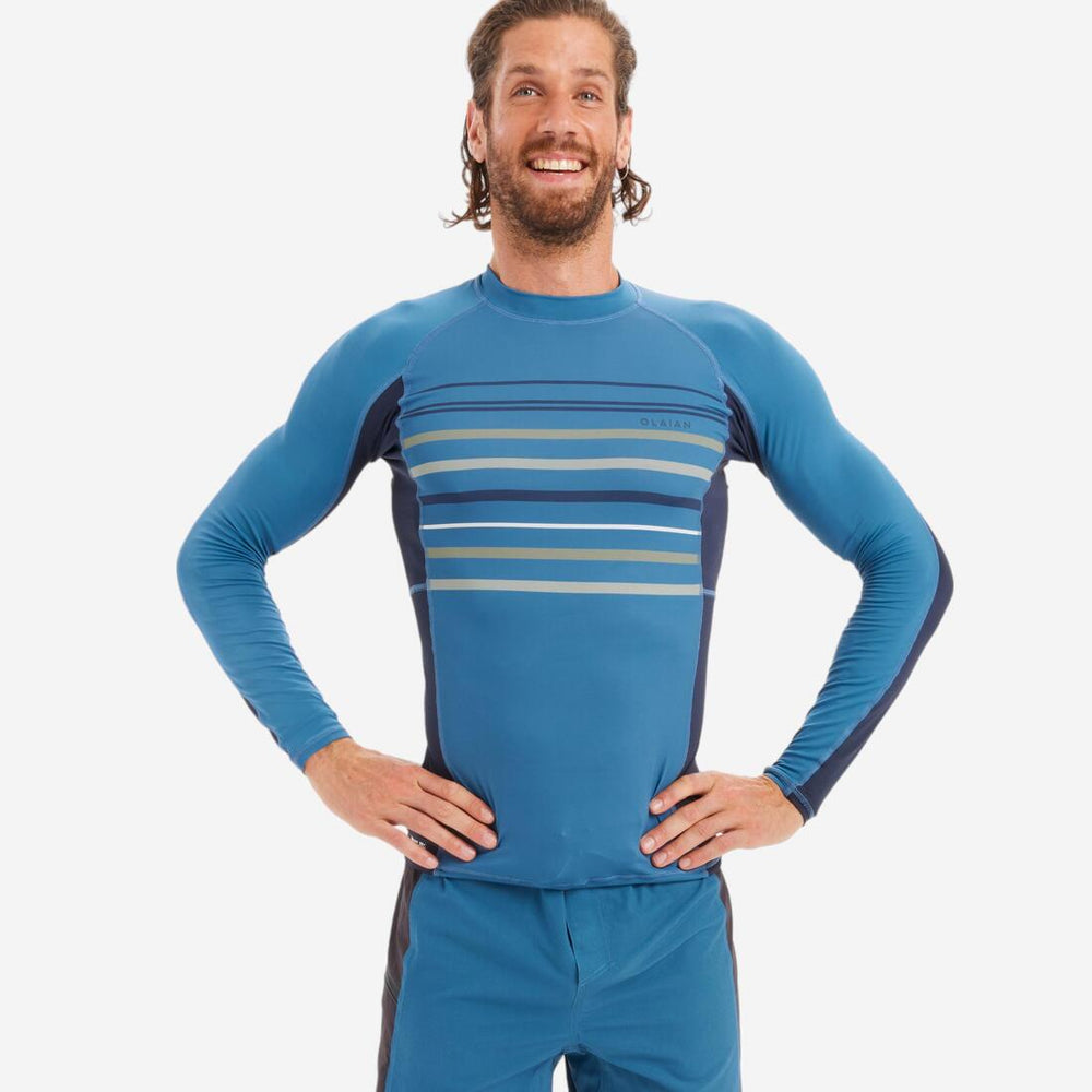 Ce tee shirt anti-UV manches longues pour homme protège du soleil en surf en eau chaude. Sa coupe ajustée et son cordon de serrage limitent les irritations et assurent la tenue dans les vagues.