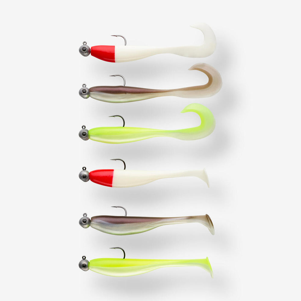 - 3 shads de 10.5 cm montés avec 3 têtes plombées rondes de 7G - 3 grubs de 11cm montés avec 3 têtes plombées rondes de 7GR Ces 2 modèles sont disponibles en 3 couleurs : tête rouge, chartreuse et smelt.