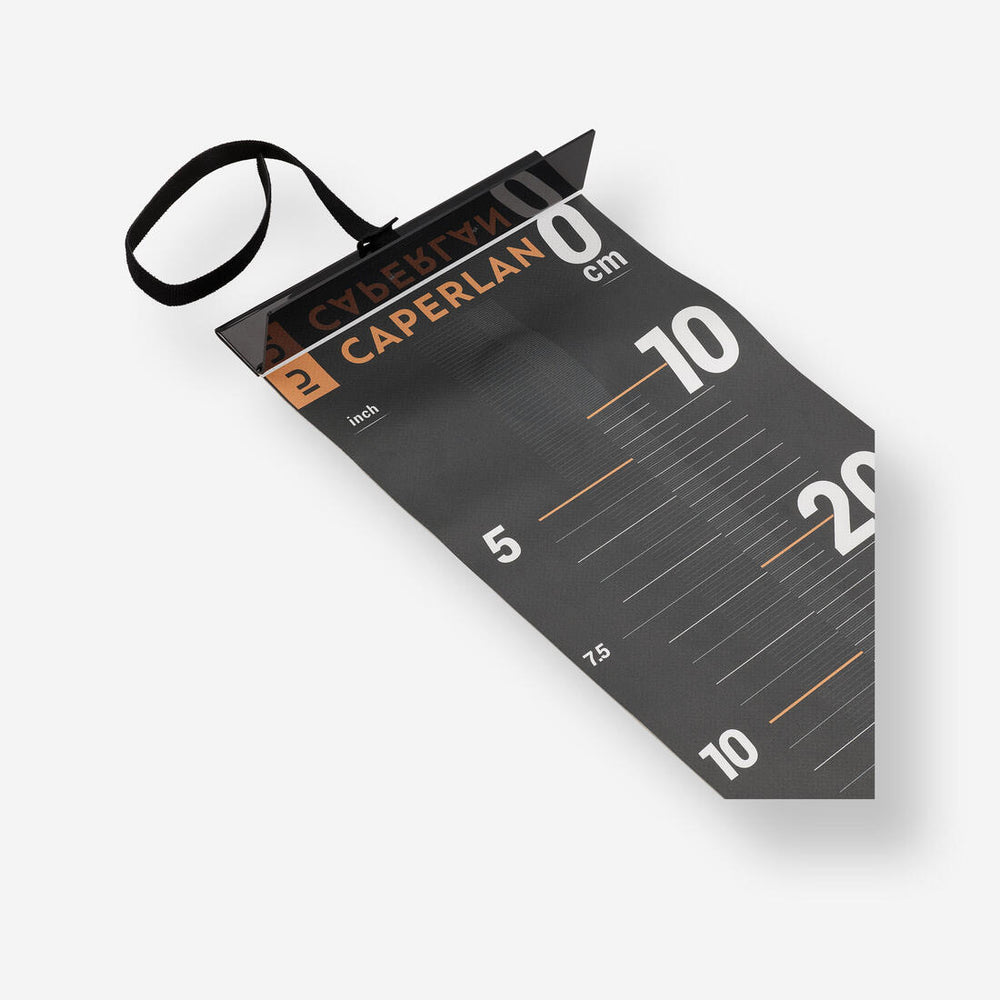 Cette toise a été pensée pour tous les pêcheurs, elle se déplie en 2 temps pour limiter son encombrement lorsqu'elle est utilisée et est suffisament large pour protéger le poisson lors de sa mesure.